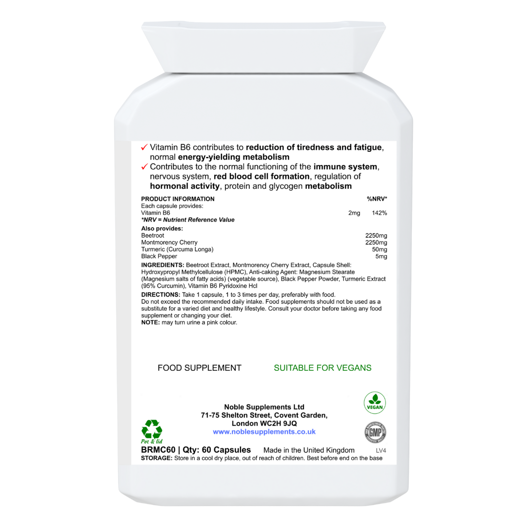 Black Pepper – 5mgIngredients: Beetroot Extract, Montmorency Cherry Extract, Capsule Shell: Hydroxypropyl Methylcellulose (HPMC), Anti-caking Agent: Magnesium Stearate (Magnesium salts of fatty acids) (vegetable source), Black Pepper Powder, Turmeric Extract (95% Curcumin), Vitamin B6 Pyridoxine Hcl.