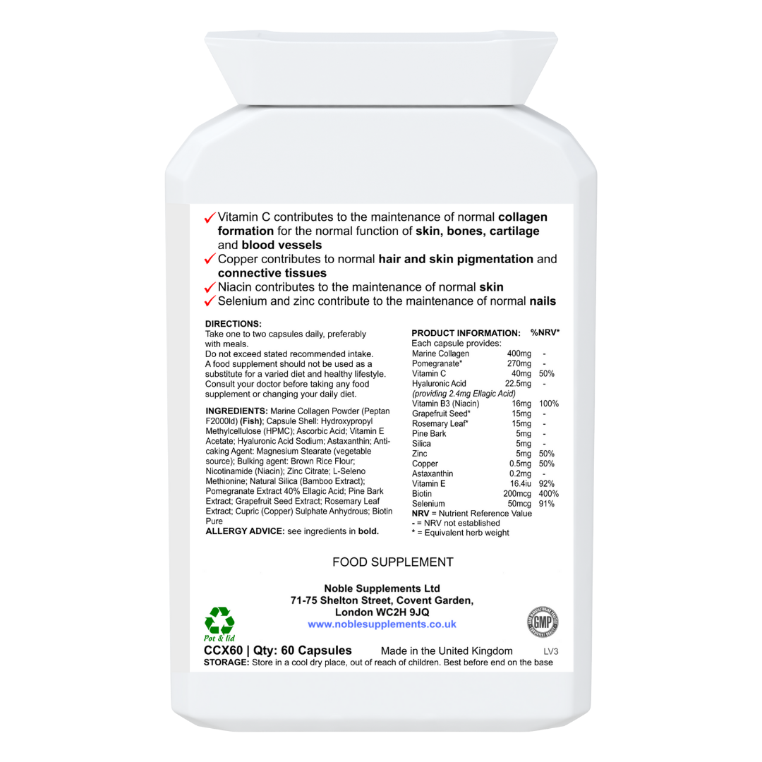 Ingredients: Marine Collagen Powder (Peptan F2000ld) (Fish), Capsule Shell: Hydroxypropyl Methylcellulose (HPMC), Ascorbic Acid, Vitamin E Acetate, Hyaluronic Acid Sodium, Astaxanthin, Anti‑caking Agent: Magnesium Stearate (Vegetable Source), Bulking Agent: Brown Rice Flour, Nicotinamide (Niacin), Zinc Citrate, L‑Seleno Methionine, Natural Silica (Bamboo Extract), Pomegranate Extract (40% Ellagic Acid), Pine Bark Extract, Grapefruit Seed Extract, Rosemary Leaf Extract, Cupric (Copper) Sulphate Anhydrous, Biotin Pure.