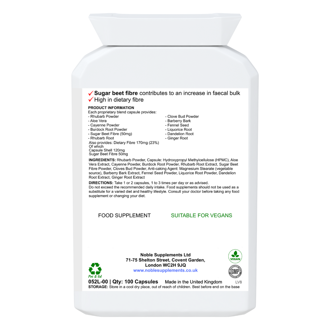 Sugar Beet Fibre – 50mgIngredients: Rhubarb Powder, Capsule: Hydroxypropyl Methylcellulose (HPMC), Aloe Vera Extract, Cayenne Powder, Burdock Root Powder, Rhubarb Root Extract, Sugar Beet Fibre Powder, Cloves Bud Powder, Anti-caking Agent: Magnesium Stearate (vegetable source), Barberry Bark Extract, Fennel Seed Powder, Liquorice Root Powder, Dandelion Root Extract, Ginger Root Extract.