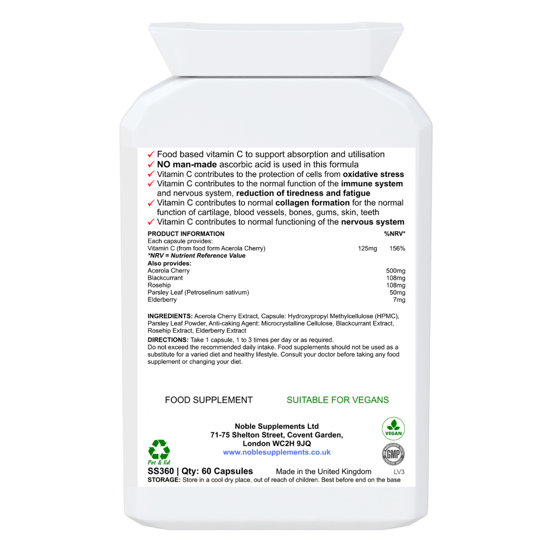 Vitamin C (from food form Acerola cherry) – 125mg 156%*NRV = Nutrient Reference Value