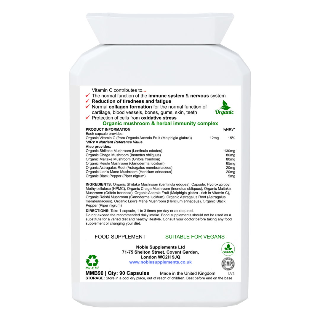 Organic black pepper (Piper nigrum) – 5mgIngredients: Organic Shiitake Mushroom (Lentinula edodes), Capsule: Hydroxypropyl Methylcellulose (HPMC) (Vegetarian), Organic Chaga Mushroom (Inonotus obliquus), Organic Maitake Mushroom (Grifola frondosa), Organic Acerola Fruit (Malphigia glabra) rich in Vitamin C, Organic Reishi Mushroom (Ganoderma lucidum), Organic Astragalus Root (Astragalus membranaceus), Organic Lion’s Mane Mushroom (Hericium erinaceus), Organic Black Pepper (Piper nigrum).