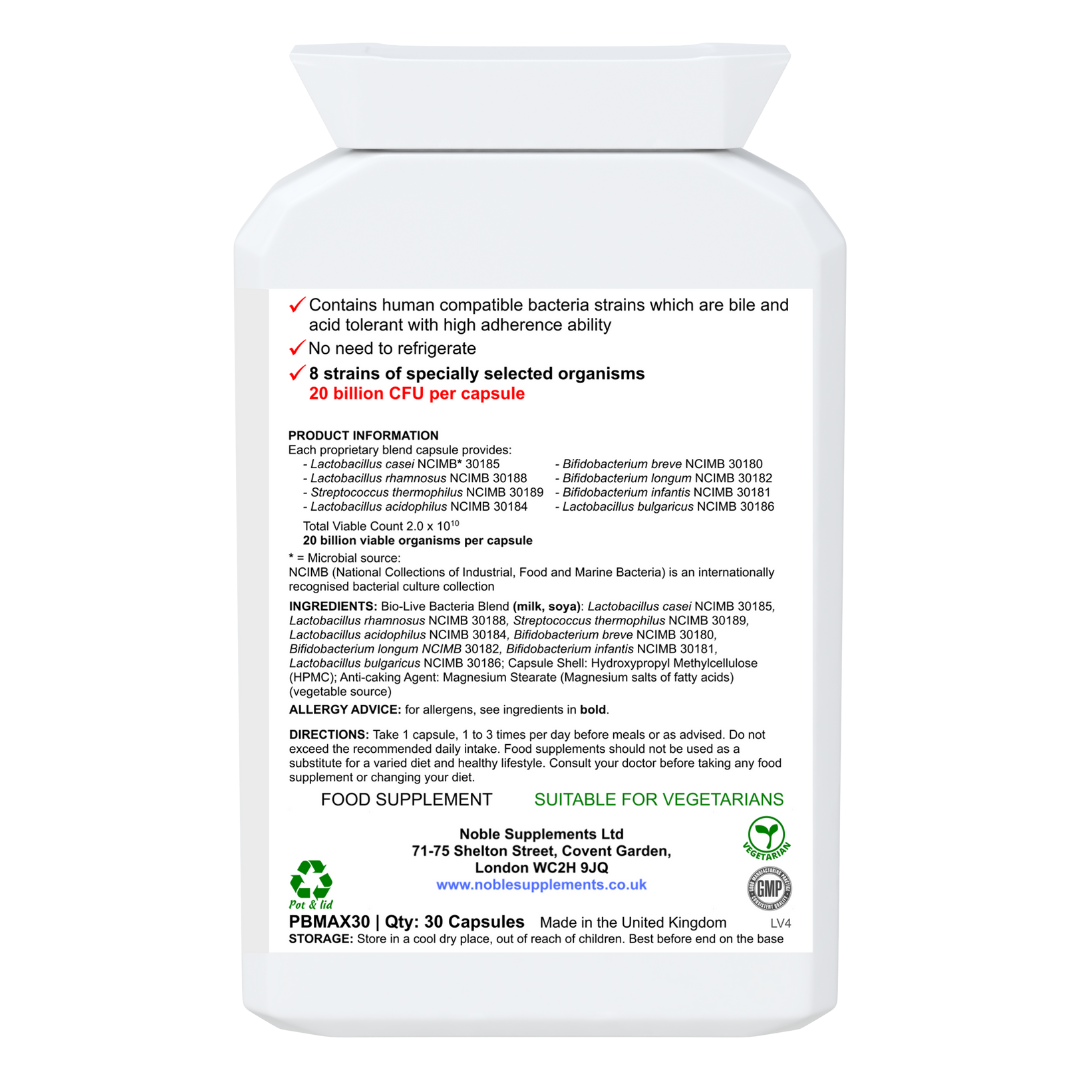 INGREDIENTS: Bio-Live Bacteria Blend (milk, soya): Lactobacillus casei NCIMB 30185, Lactobacillus rhamnosus NCIMB 30188, Streptococcus thermophilus NCIMB 30189, Lactobacillus acidophilus NCIMB 30184, Bifidobacterium breve NCIMB 30180, Bifidobacterium longum NCIMB 30182, Bifidobacterium infantis NCIMB 30181, Lactobacillus bulgaricus NCIMB 30186; Capsule Shell: Hydroxypropyl Methylcellulose (HPMC) (Vegetarian); Anti-caking Agent: Magnesium Stearate.